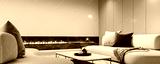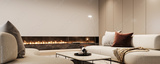 Modern luxury interior design of living room with fireplace and empty white mockup wall background 3D Rendering, 3D Illustration
