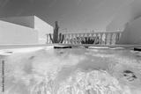 Panoramic view above the water level of a modern outdoor jacuzzi bathtub for leisure tourists.