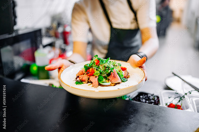 chef hand cooking Roast beef salad with vegetables on restaurant kitchen