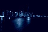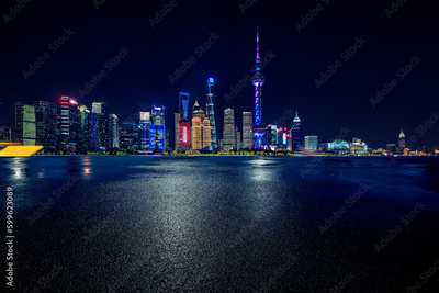 Asphalt road and city skyline with modern buildings in Shanghai at night, China.