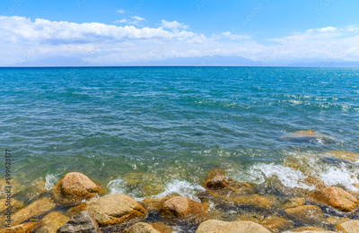 Beautiful Sayram Lake natural scenery in Xinjiang, China. Clear lake water and rocks under blue sky.