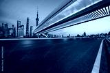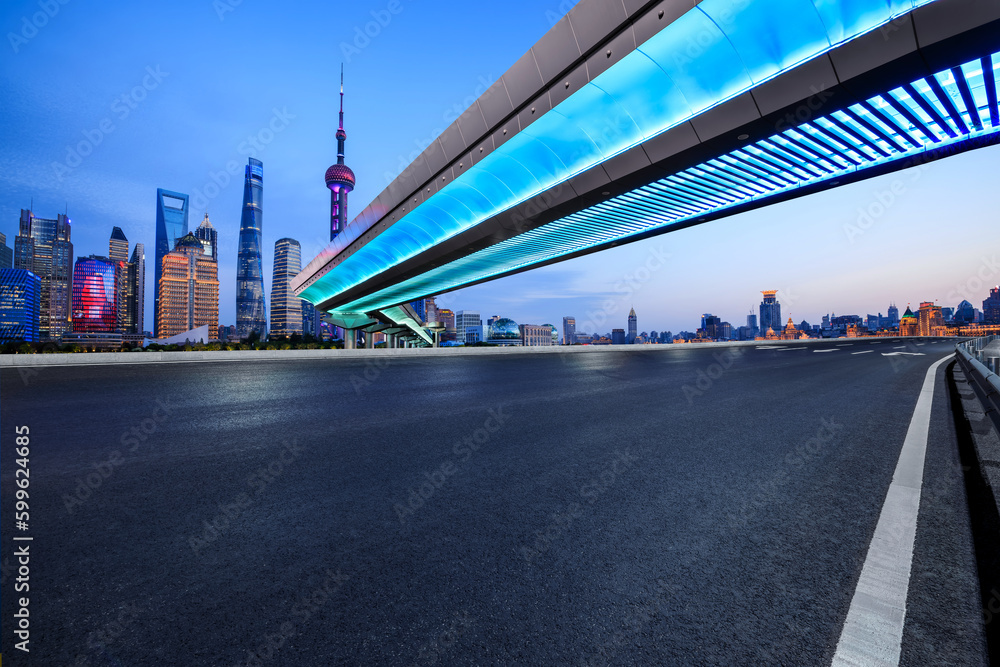 Asphalt road and city skyline with modern buildings in Shanghai, China.