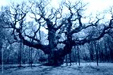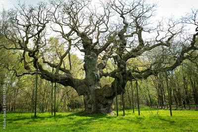 The 1000 year Mighty Oak Tree seen during springtime. Many suspension poles are seen holding up the oldest oak tree in the UK.