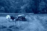 cows in a field with the water tank and the dirt road, vintage look