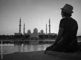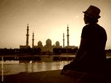 travel to the United Arab Emirates, Happy young asian female traveler with backpack and hat in Wahat Al Karama or Oasis of Dignity, permanent memorial for its martyrs, and Shaikh Zayed Grand Mosque.