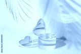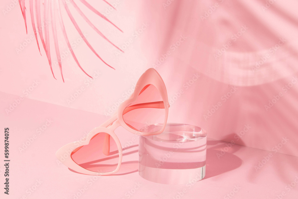 Summer creative layout with pink palm leaves, heart sunglasses and glass cylinder on pastel pink background. 80s or 90s retro aesthetic idea. Minimal summer fashion idea.