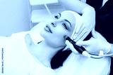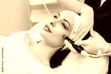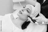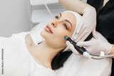 View of doctor cosmetologist doing anti aging procedure in cosmetology office. Satisfied woman in disposable hat lying on couch and relaxing. Working with Apparatus.