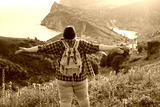 An overweight woman walks in the mountains, actively spends her weekend, active life, active lifestyle, excess weight.
