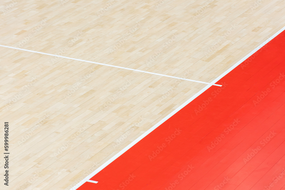 Wooden floor volleyball, basketball, badminton, futsal, handball court. Wooden floor of sports hall with marking lines line on wooden floor indoor, gym court