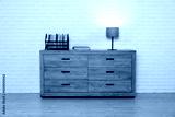 Wooden chest of drawers, books and lamp near white brick wall. Interior design