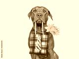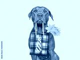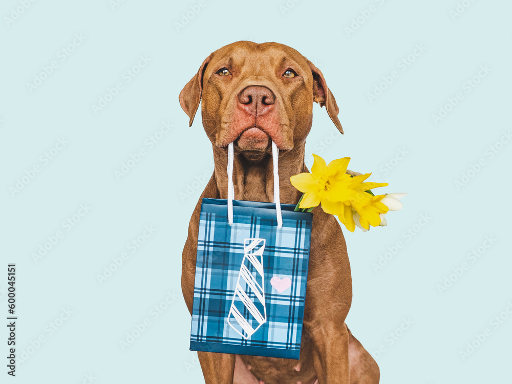 Cute puppy and shopping bag. Sales preparation. Close-up, indoors. Day light, studio shot. Isolated background. Concept of care, education and raising pet
