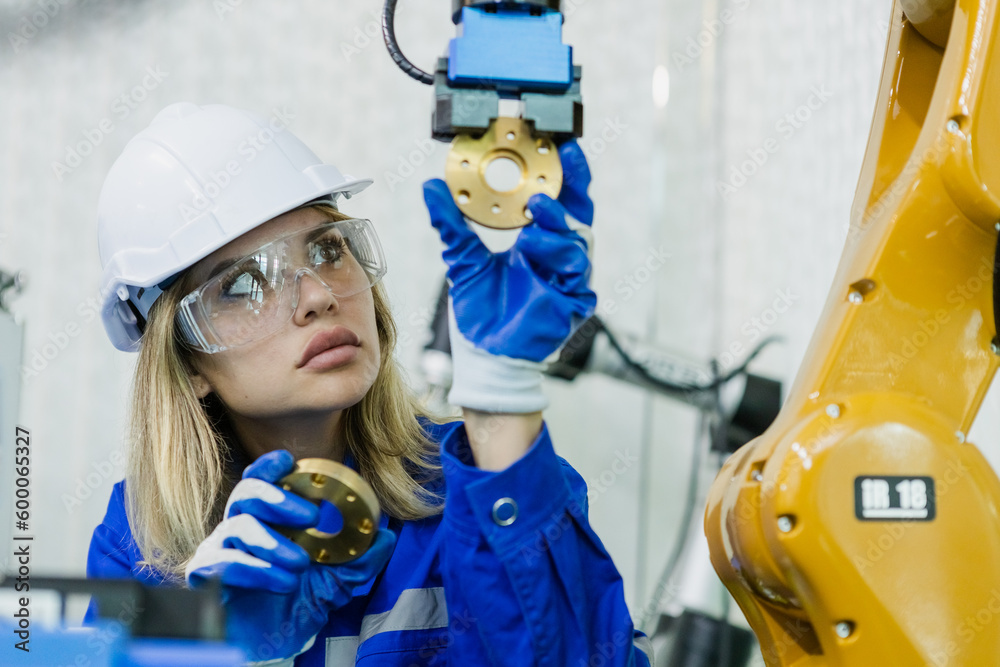Female technician engineer robotics working at industrial modern factory. woman working at factory innovation automation robot. Staff introduces operation of robots in production process.