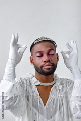 Young black cool funny gay man 20s with make up wearing fashionable white shirt and crown dancing, isolated on plain pastel white background studio portrait. People lifestyle fashion lgbtq concept