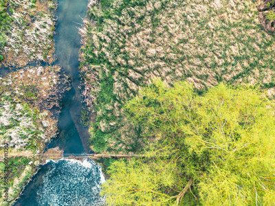 Drone view of marsh and a fresh inland water way famous for salmon.