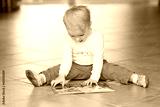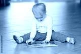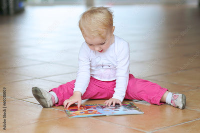 smart toddler girl reading book sitting indoors on tiles floor
