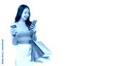 Young asian lady using mobile phone holding credit card carry shopping bags isolated over white background and copy space Smiling young girl purchasing online through phone using credit card