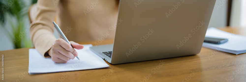Business Professional Accountant Woman working on laptop computer making research for planning startup at desktop working process in office