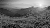 Magic pink flowers rhododendrons at sunset. Carpathian mountains, National Park Chornohora, Ukraine, Europe.