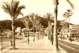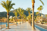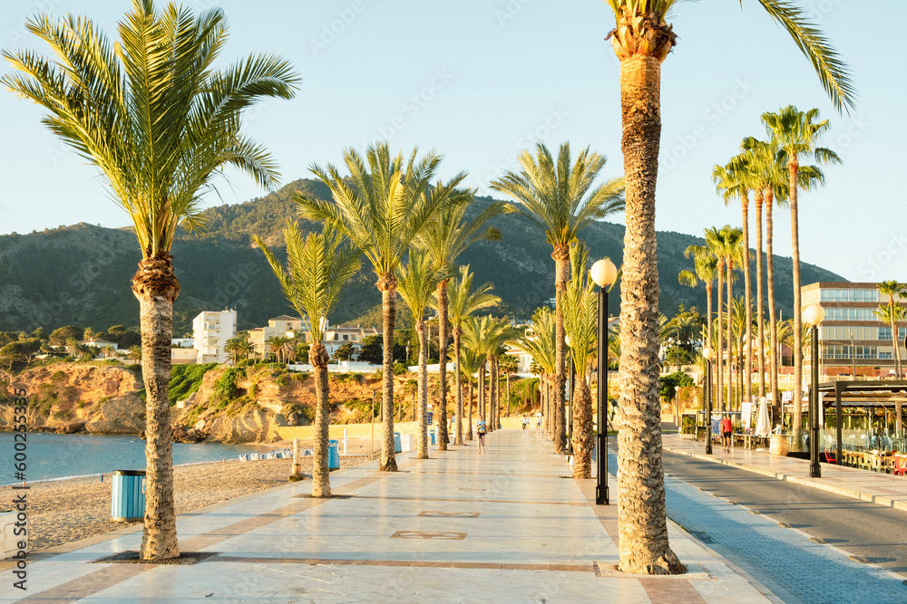 View to beautiful Albir town with main boulevard promenade, seaside beach and Mediterranean sea. Albir is small resort city between Altea and Benidorm, Alicante province, Spain