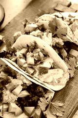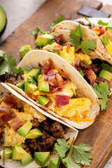 Breakfast tacos with sausage, eggs, bacon and avocado