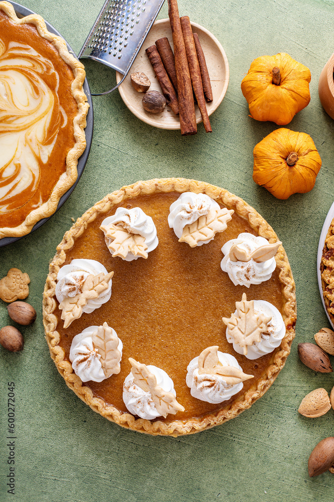 Traditional pumpkin pie for Thanksgiving with whipped cream
