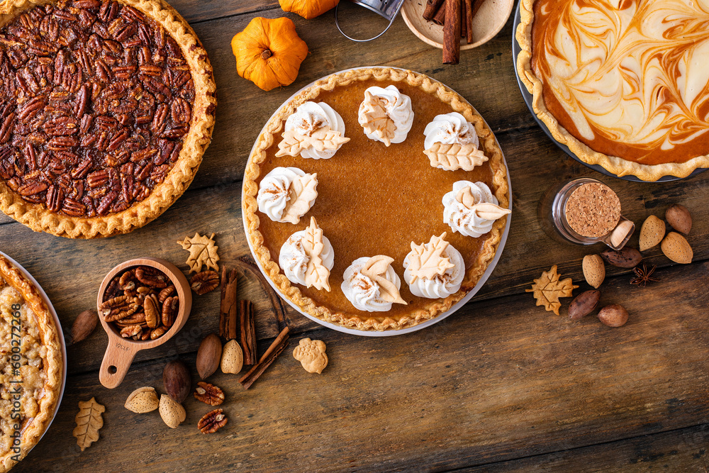 Traditional Thanksgiving pies with pumpkin pie in the middle