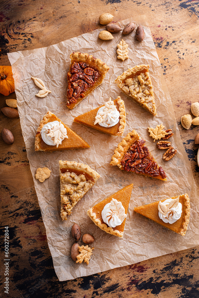 Traditional Thanksgiving pies cut into slices with pumpkin, pecan and crumble