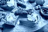 Traditional Thanksgiving pies cut into slices with pumpkin, pecan and crumble