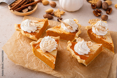 Pumpkin pie with cheesecake swirl, dessert variation for Thanksgiving