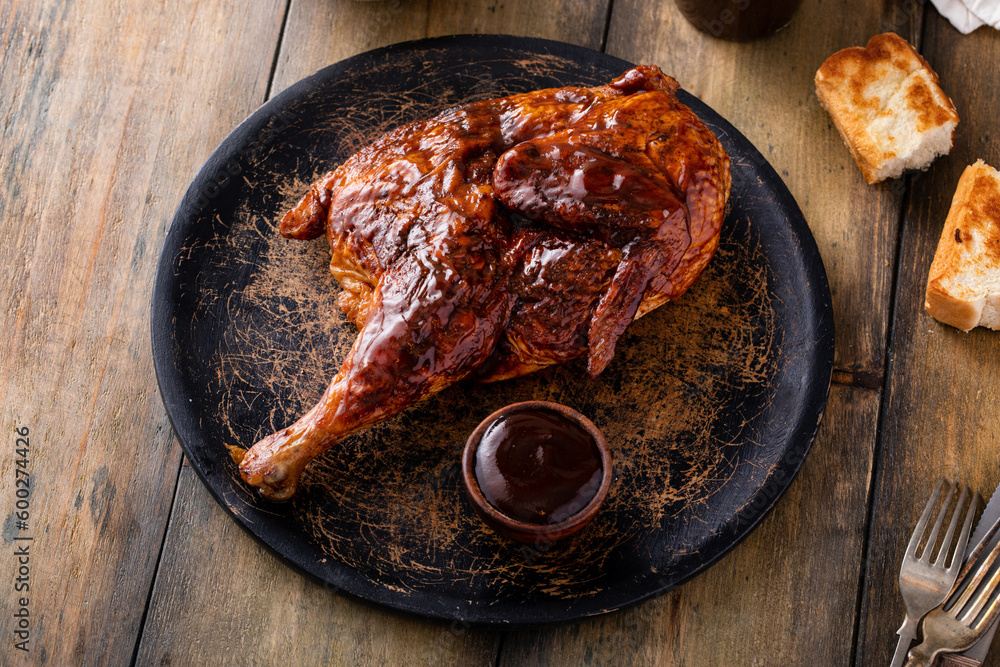 Barbeque smoked half chicken with salad and toast
