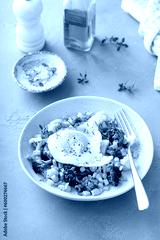 Healthy breakfast bowl with cooked vegetables and fried egg