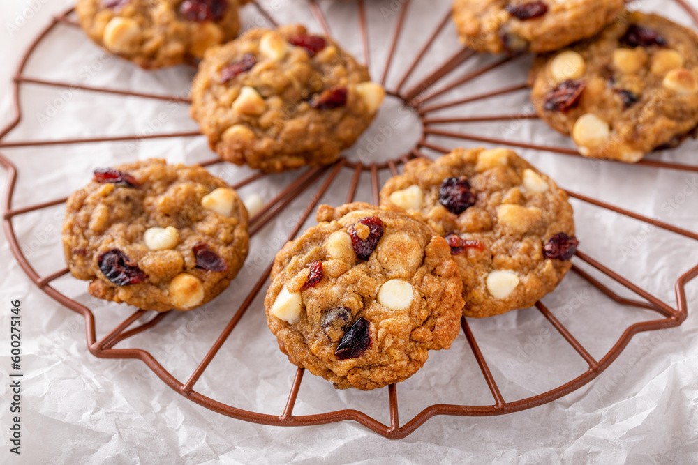White chocolate and cranberry cookies on a cooling rack