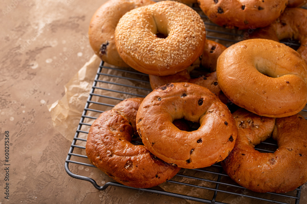 Variety of freshly baked bagels on a cooling rack