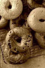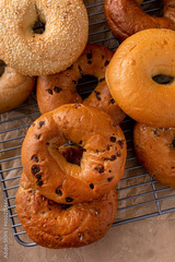 Variety of freshly baked bagels on a cooling rack