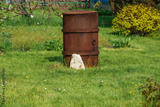 Stara zardzewiała stalowa beczka stojąca w ogrodzie na xielonym zadbanym trawniku
