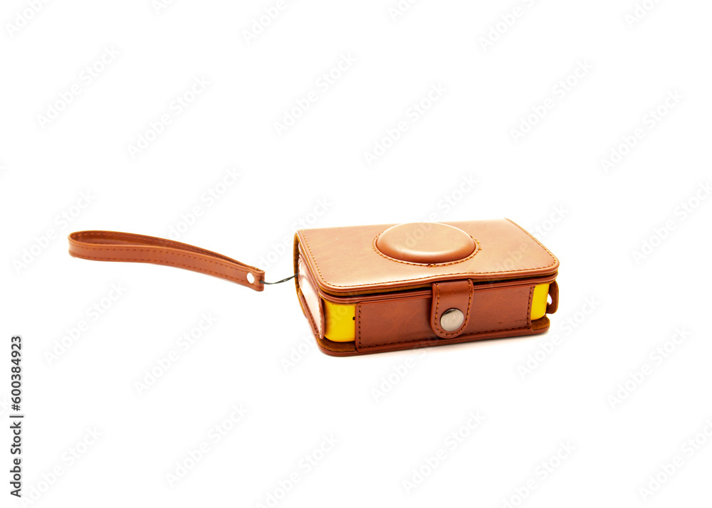 Top view brown leather case with strap for instant camera lens protection isolated on white background
