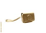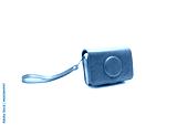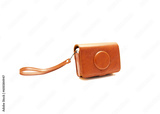 Side view brown leather case with strap for instant camera lens protection isolated on white background