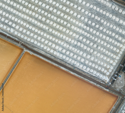 Aerial top view sea salt farm. Pile of brine salt. Raw material of salt industrial. Sodium Chloride mineral. Evaporation and crystallization of sea water. White salt harvesting. Agriculture industry.