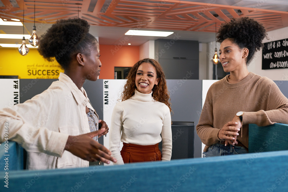 Three young diverse female colleagues stand and chat in open plan office