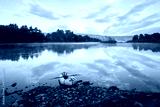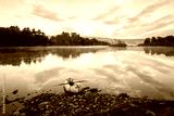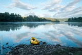 Yellow rubber boat packraft with red padle on beautiful sunrise river. Packrafting background. Active lifestile concept