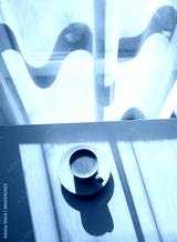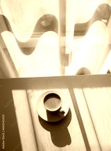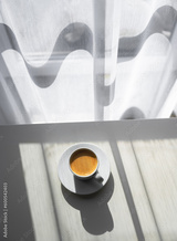 Espresso coffee cup on table near window with morning light. Food and drink photography