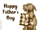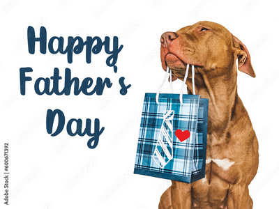 Happy Father's Day. Cute brown puppy and a gift bag. Close-up, indoors. Studio shot. Congratulations for family, loved ones, friends and colleagues. Pet care concept