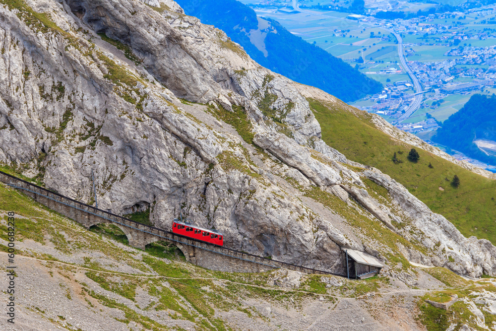 Cogwheel train climbing to the top of Mount Pilatus in Canton Lucerne, Switzerland. World's steepest cogwheel railway