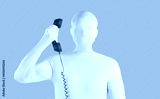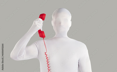 Person in faceless bodysuit disguise makes anonymous incognito phone call from unknown number. Strange unrecognizable young man wearing white spandex costume holding red vintage telephone receiver