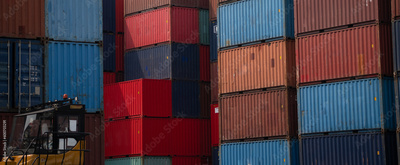 Container logistic. Cargo and shipping business. Container ship for import and export logistic. Container freight station. Logistic industry from port to port. Container at harbor for truck transport.