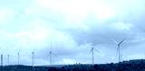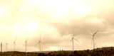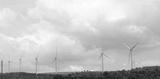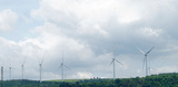Wind energy. Wind power. Sustainable, renewable energy. Wind turbines generate electricity. Windmill farm on mountain with cloudy sky. Green technology. Renewable resource. Sustainable development.