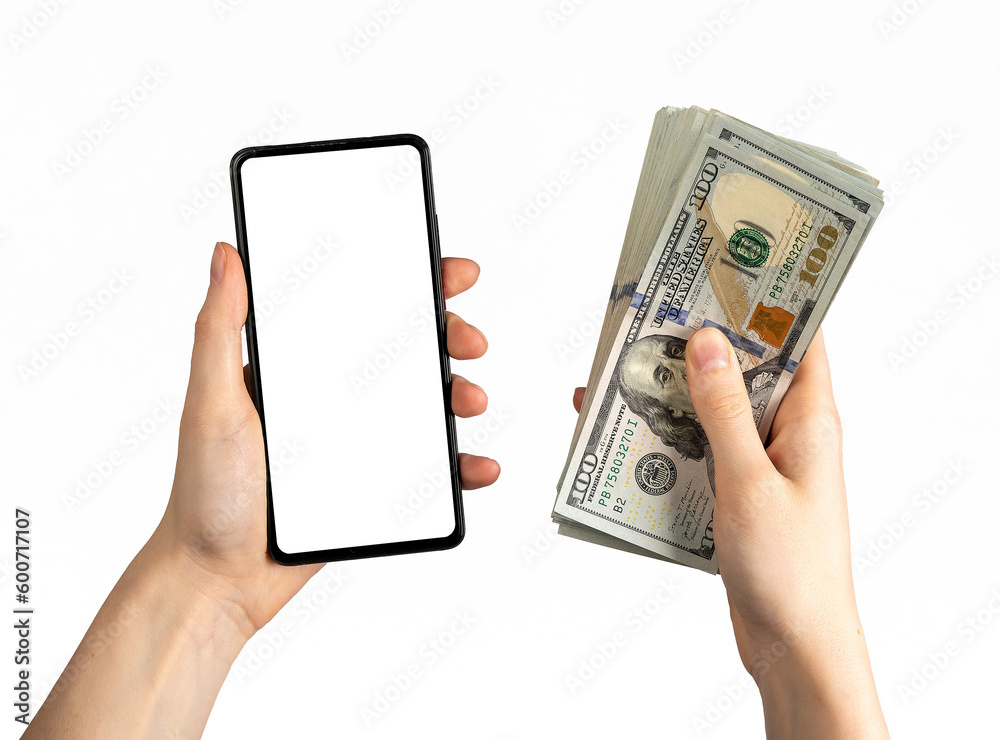 Mobile phone screen mockup for finance app. Smartphone mock up and money cash in hand isolated on white background