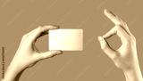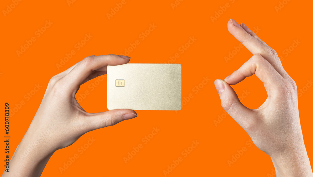 Bank card mock up in hand. Bankcard mockup and OK gesture on orange background