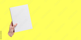 Book mock up, blank hard cover for literature in hand on yellow banner background