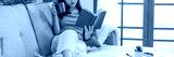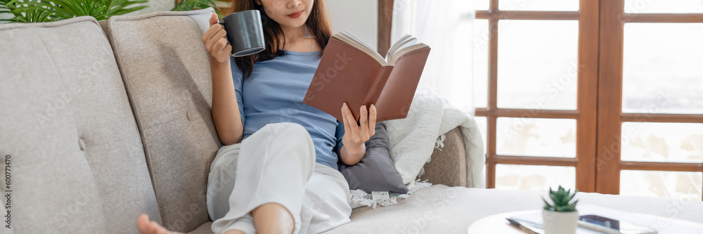 Young asian woman reading a book at home, girl hold book Education school university college concept.concept.
